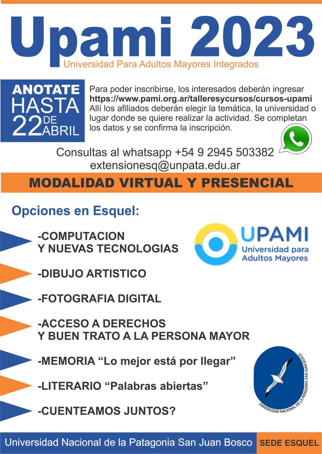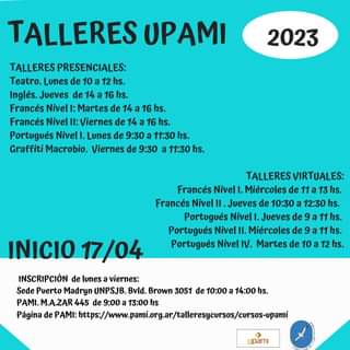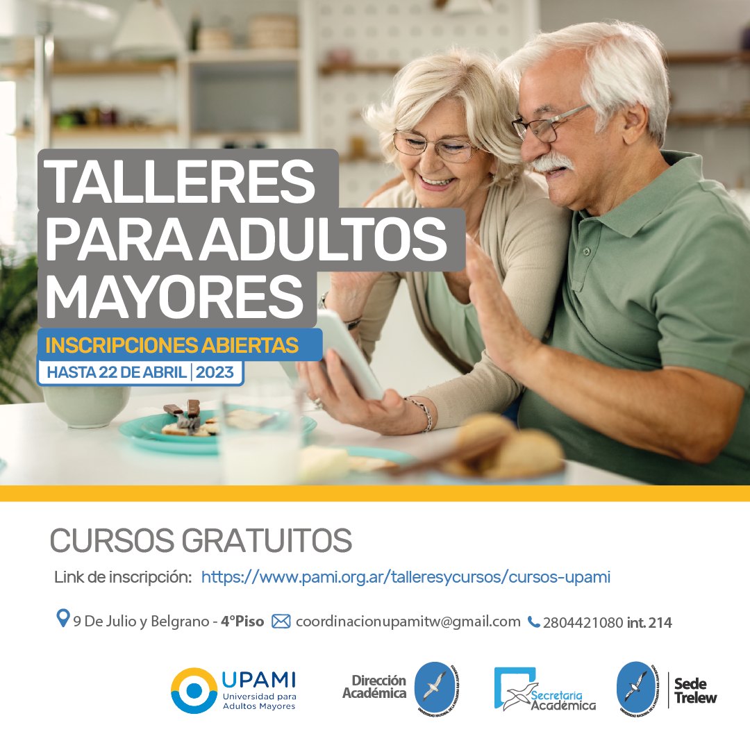 Se encuentran abiertas las inscripciones para los Talleres UPAMI. Inicio 17 de abril 2023. Sede Puerto Madryn UNPSJB- Bvld. Brown 3051 de 10:00 a 14:00 hs. PAMI MAZAR 445 de 9:00 a 13:00 hs.