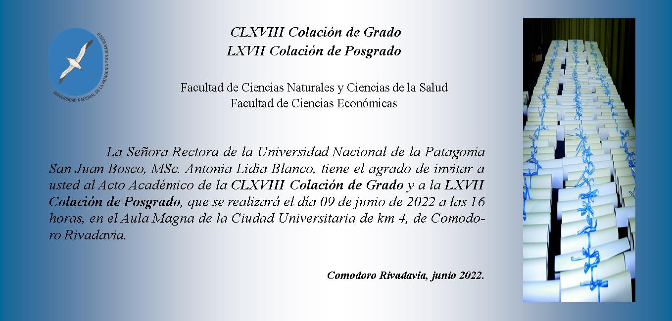 La rectora de la Universidad Nacional de la Patagonia San Juan Bosco, Lidia Blanco, presidirá los actos de entrega de títulos a las y los egresados. Ambos actos se realizarán el jueves 9 de junio y viernes 1o de junio, en el Aula Magna de la sede Comodoro Rivadavia, Ciudad Universitaria, Km 4, a partir de la hora 16.00.