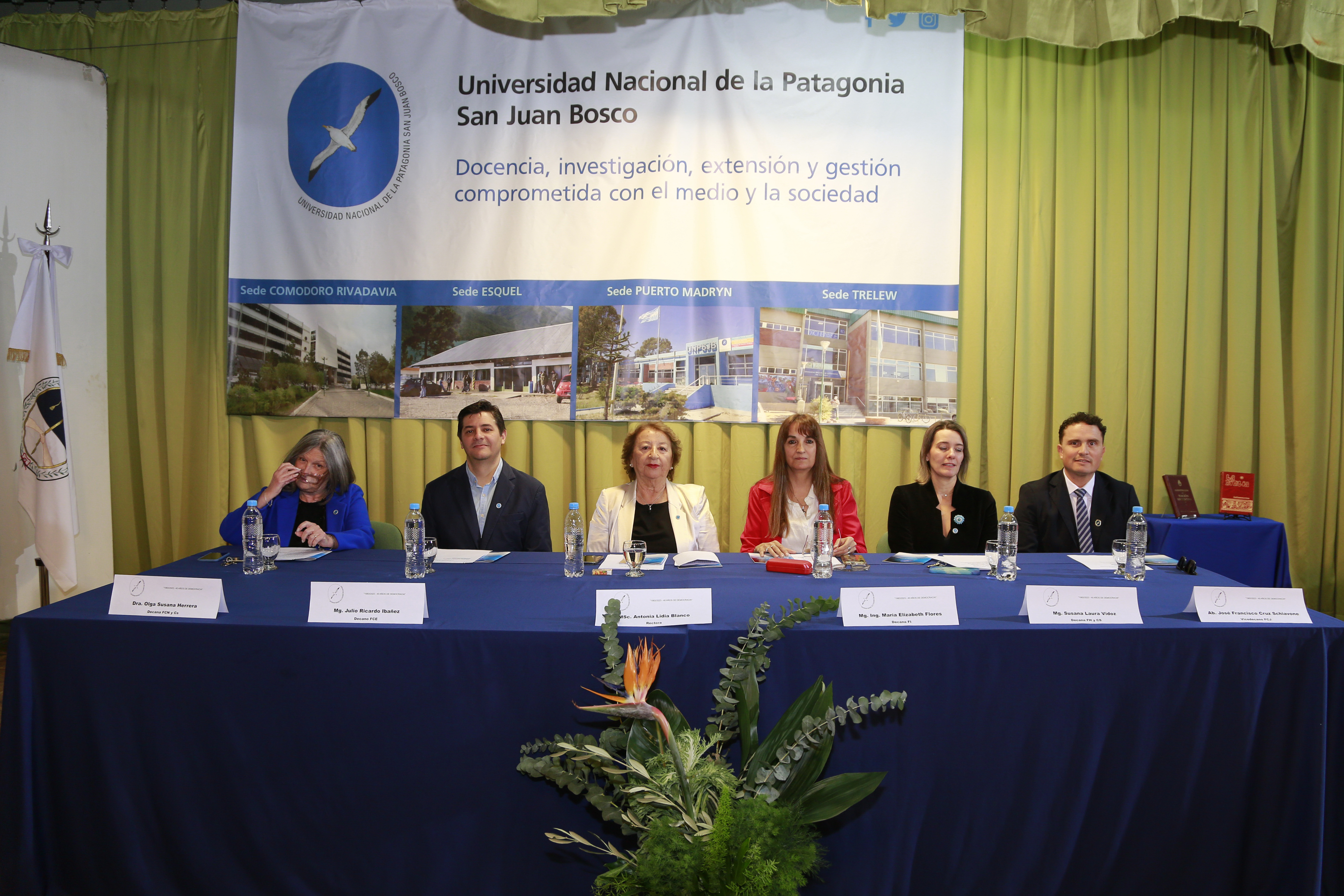 La educación superior como un derechoLuego se escuchó el mensaje de la rectora Mag. Antonia Lidia Blanco. Recordó que el acto de colación se enmarca en la conmemoración de los 40 años ininterrumpidos de democracia en Argentina, además de los 49 años de creación de la Universidad Nacional de la Patagonia San Juan Bosco, ocurrido el 4 de mayo del año 1974, como resultado de “una lucha social, protagonizado por jóvenes patagónicos que reclamaban el derecho a una educación pública de calidad y sobre todo gratuita, esa educación superior pública y gratuita surge a partir de ese 4 de mayo que se crea esta universidad. Nuestro agradecimiento y reconocimiento a esos jóvenes que lucharon y conquistaron más derechos”, afirmó. Retomó las palabras de los graduados y graduadas, y luego sostuvo “no podemos dejar de recordar los principios consagrados en la Reforma del 18 (1918) a quienes nos dejaron como legado la autonomía universitaria, el cogobierno, la extensión universitaria”. Asimismo, se refirió al impacto de la Ley de 1949 que reafirmó el principio de “una universidad de y para el pueblo al desestimar el carácter arancelario y elitista del ingreso a las universidades y garantizó la gratuidad que lleva ya 74 años de vigencia permitiendo el ingreso de muchos al sistema universitario gratuidad que hoy más que nunca hay que cuidar, defender y fortalecer todos los días”.