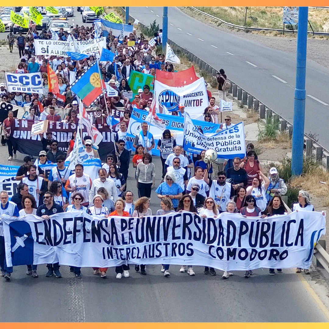 Antes de la movilización se realizó un acto en el que tomó la palabra la Rectora de la UNPSJB, Lidia Blanco, las y los estudiantes: Aldana Martinez y Rocio Pisano UNPA Río Gallegos, Daniela Gutiérrez y Mau Villareta de Caleta Olivia, además de Lucas Navarro Presidente del Centro de Estudiantes FCNyCS. Asimismo expusieron el secretario General del gremio no docente de la Universidad de Tierra del Fuego e Islas del Sur, Eduardo Candino y Karina Dodman, dirigente del sindicato docente de la Universidad de la Patagonia Austral y Conadu Histórica.