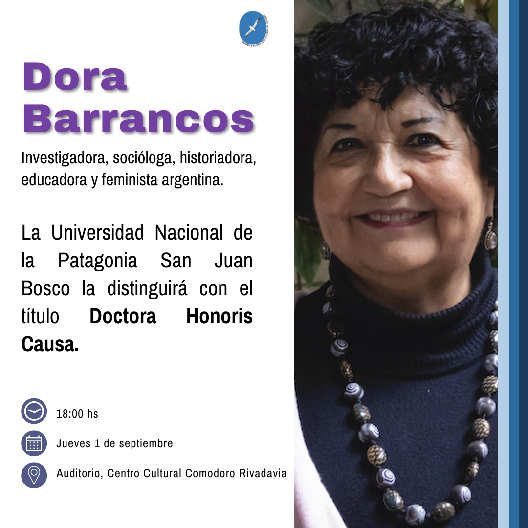 Mañana jueves a las 18 horas autoridades de la UNPSJB entregarán el reconocimiento Doctora Honoris Causa a la docente e investigadora, Dora Barrancos, quien visitará nuestra ciudad en ocasión de la Feria del Libro.