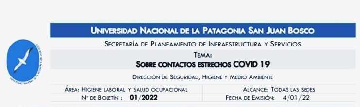 La Dirección de Seguridad, Higiene y Medio Ambiente, dependiente de la Secretaría de Planeamiento, Infraestructura y Servicios de la Universidad Nacional de la Patagonia San Juan Bosco, comunica que están vigentes en nuestra Institución los Protocolos P.33.02.20, P.34.03.20 y P.35.02.21.