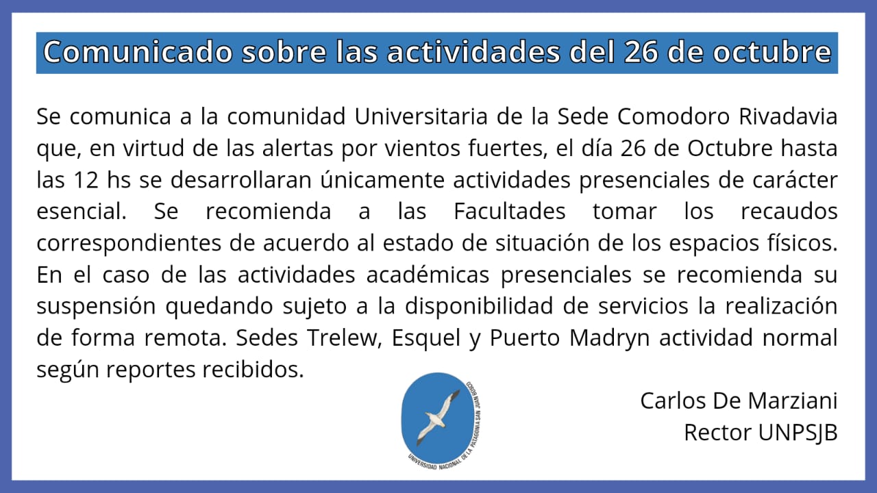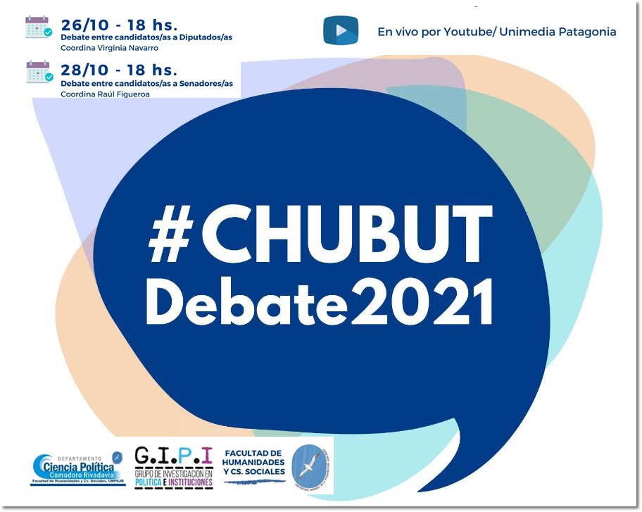 Las y los candidatos a Diputados y Senadores Nacionales por la provincia de Chubut, participarán de dos debates públicos, a realizarse los días 26 y 28 de octubre, respectivamente, a partir de las 18 horas en el Aula Magna de la UNPSJB en Comodoro Rivadavia.