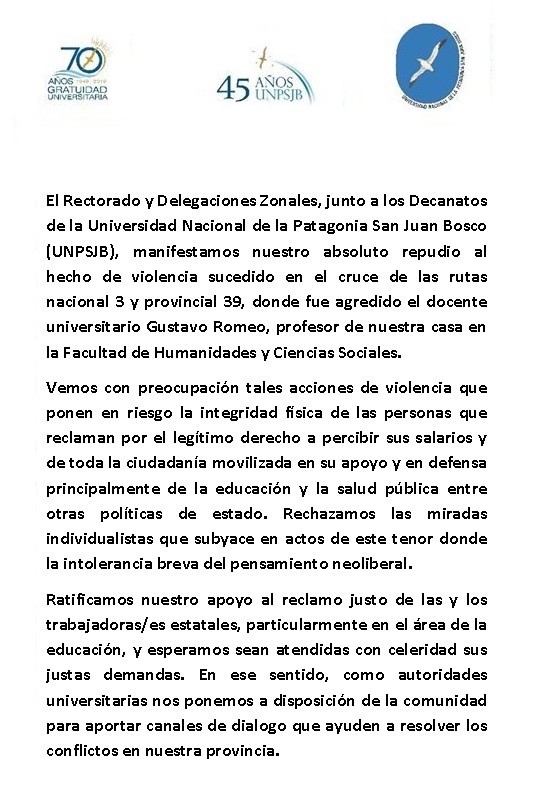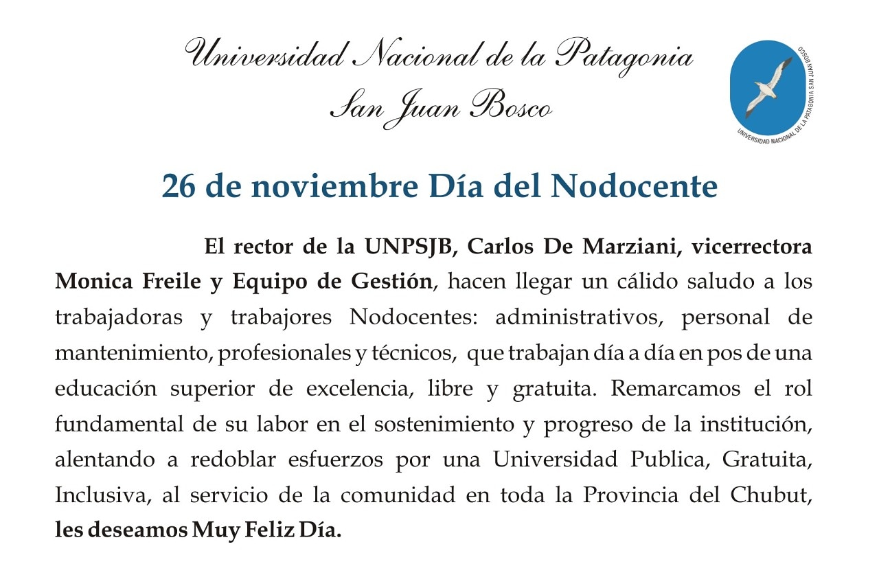 El Rector, Carlos De Marziani, la Vicerrectora, Mónica Freile, y su equipo de gestión hacen llegar un afectuoso saludo a toda la comunidad de la ciudad de Comodoro Rivadavia con motivo de celebrarse el 119° aniversario de su fundación.