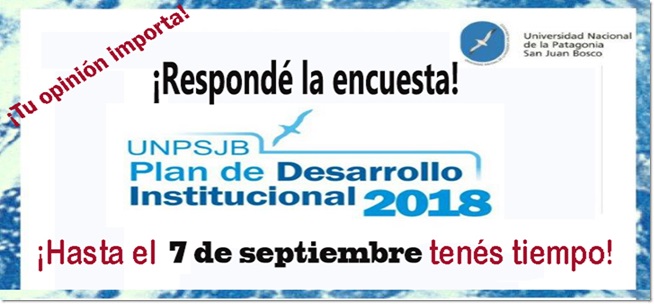 La Comisión del PDI informa a docentes, estudiantes , graduados y no-docentes que prorroga el plazo para responder la encuesta institucional sobre el funcionamiento de la UNPSJB hasta el dia 7 de septiembre. ¡Tu opinión vale!