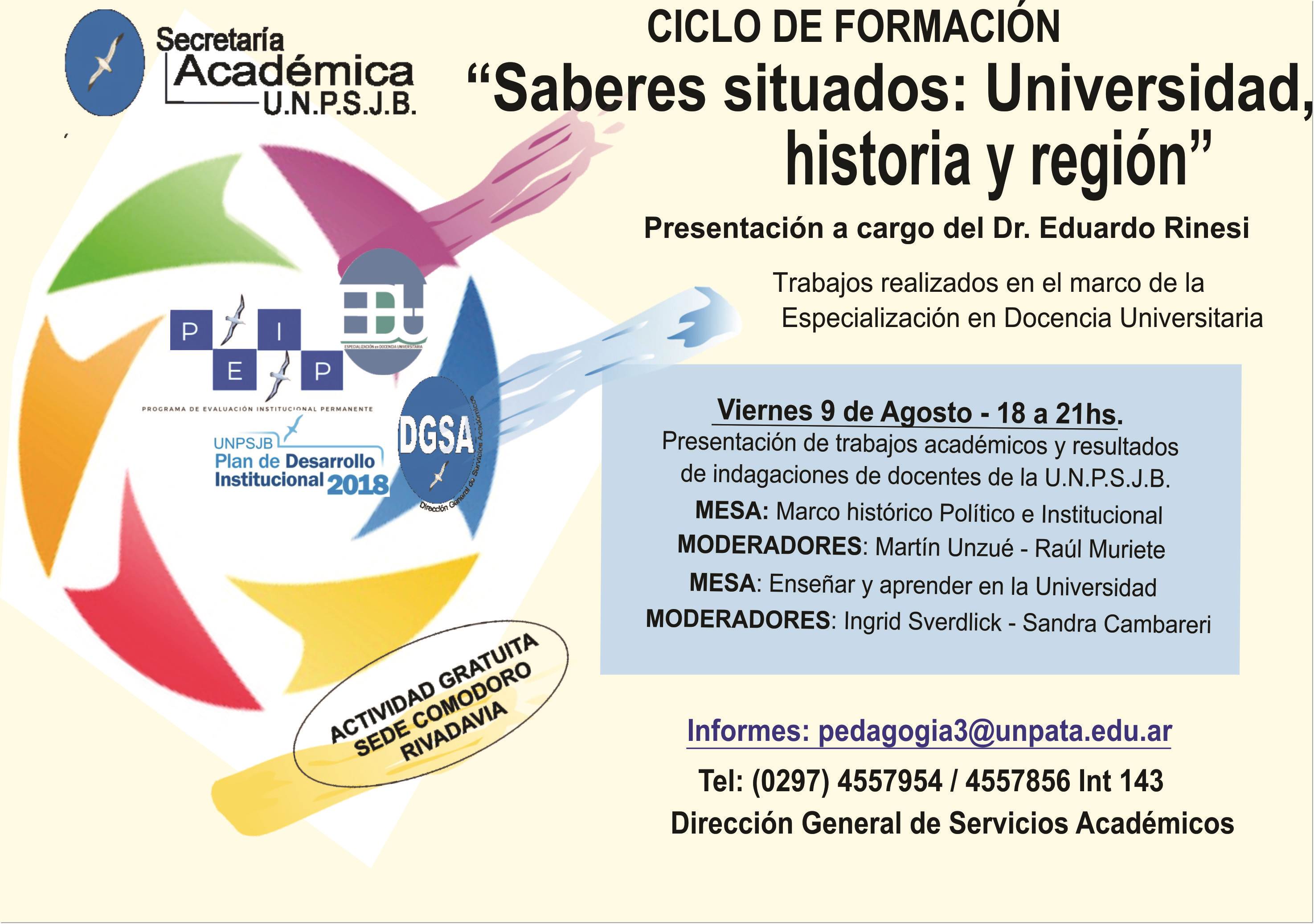 Los equipos de la Dirección Gral de Servicios Académicos y Programa de Evaluación Institucional Permanente informan a la comunidad universitaria que la Conferencia Inaugural del Ciclo de Formación "Saberes situados: universidad, historia y región" a cargo del Dr. Eduardo Rinesi ha sido reprogramada por razones vinculadas a la cancelación de vuelos de la empresa Aerolíneas Argentinas.