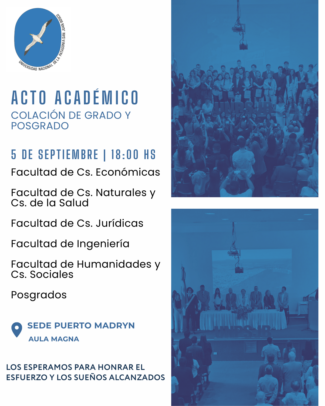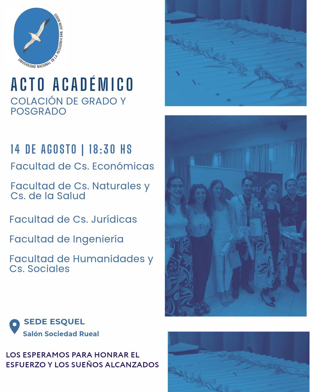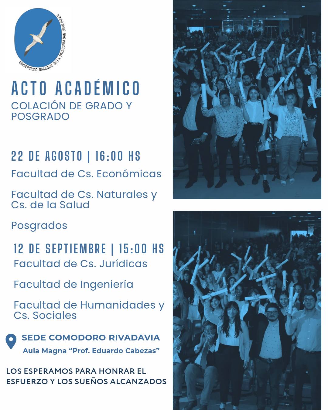 La Señora rectora de la Universidad Nacional de la Patagonia San Juan Bosco, MSc. Antonia Lidia Blanco, tiene el agrado de invitar a usted al Acto Académico de la CXC Colación de Grado, que se realizará el día 12 de septiembre de 2025 a las 15 horas, en el Aula Magna “Prof. Eduardo Cabezas” de la Ciudad Universitaria de km 4, de Comodoro Rivadavia.