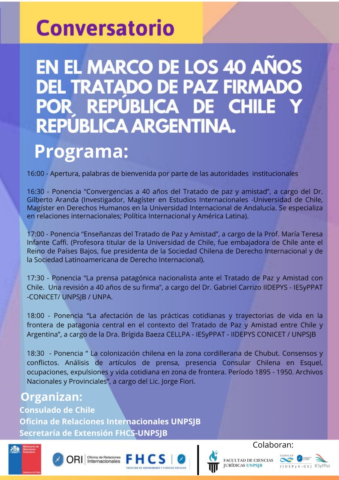 En conmemoración de los 40 años del Tratado de Paz y Amistad firmado entre la República de Chile y la República Argentina, se llevará a cabo un conversatorio en la Universidad Nacional de la Patagonia San Juan Bosco (UNPSJB) en su sede de Comodoro Rivadavia. El evento se desarrollará el día 27 de noviembre a las 16:00 horas en el Aula 102 de la institución, y se invita a la comunidad a participar en este espacio de reflexión y análisis.