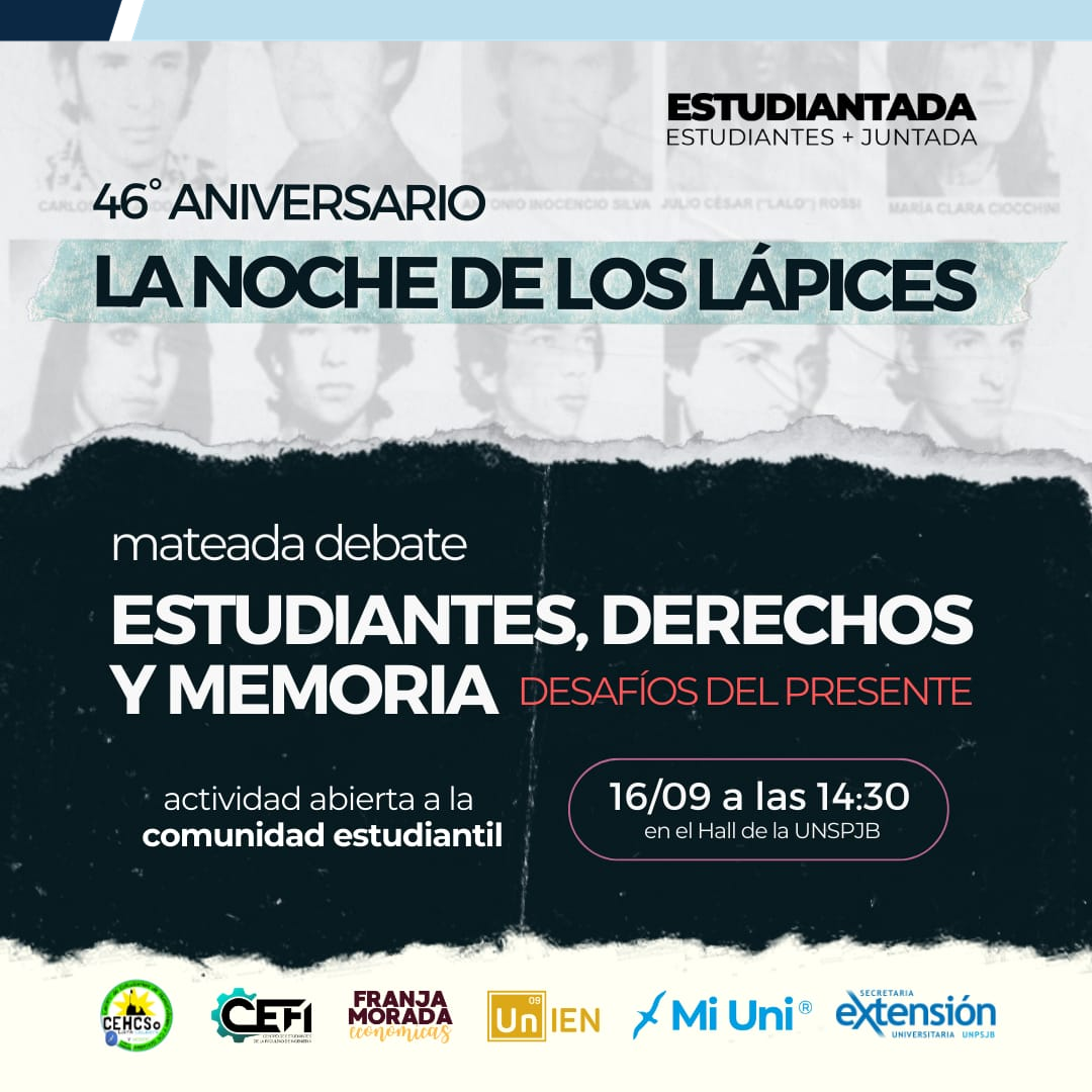 Desde las 14:30, en el hall de entrada de la Universidad, se realizará la mateada debate "Estudiantes, derechos y memoria", organizada por los estudiantes para la comunidad estudiantil. Una instancia planteada para repensar colectivamente la importancia de la educación, la democracia y de los estudiantes como agentes de cambio.