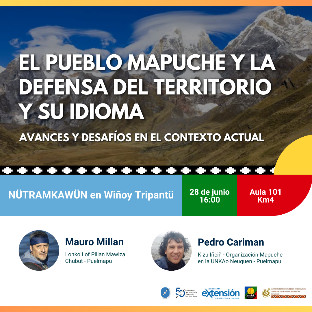 Te invitamos al conversatorio Nütramkawün: “El Pueblo Mapuche y la defensa del territorio y su idioma. Avances y desafíos en el contexto actual”. Se realizará el viernes 28 de junio a las 16 hs. en el aula 101 (primer piso) de la ciudad universitaria en Km. 4.
