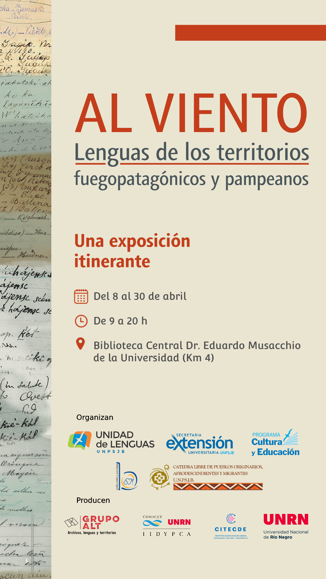 La exposición itinerante “Al viento” llega a la Biblioteca Central Dr. Eduardo Musacchio de la UNP, ubicada en Ciudad Universitaria, Km. 4. Esta muestra se centra en las lenguas de los territorios fuegopatagónicos y pampeanos, incluyendo aquellas habladas en Tierra del Fuego.