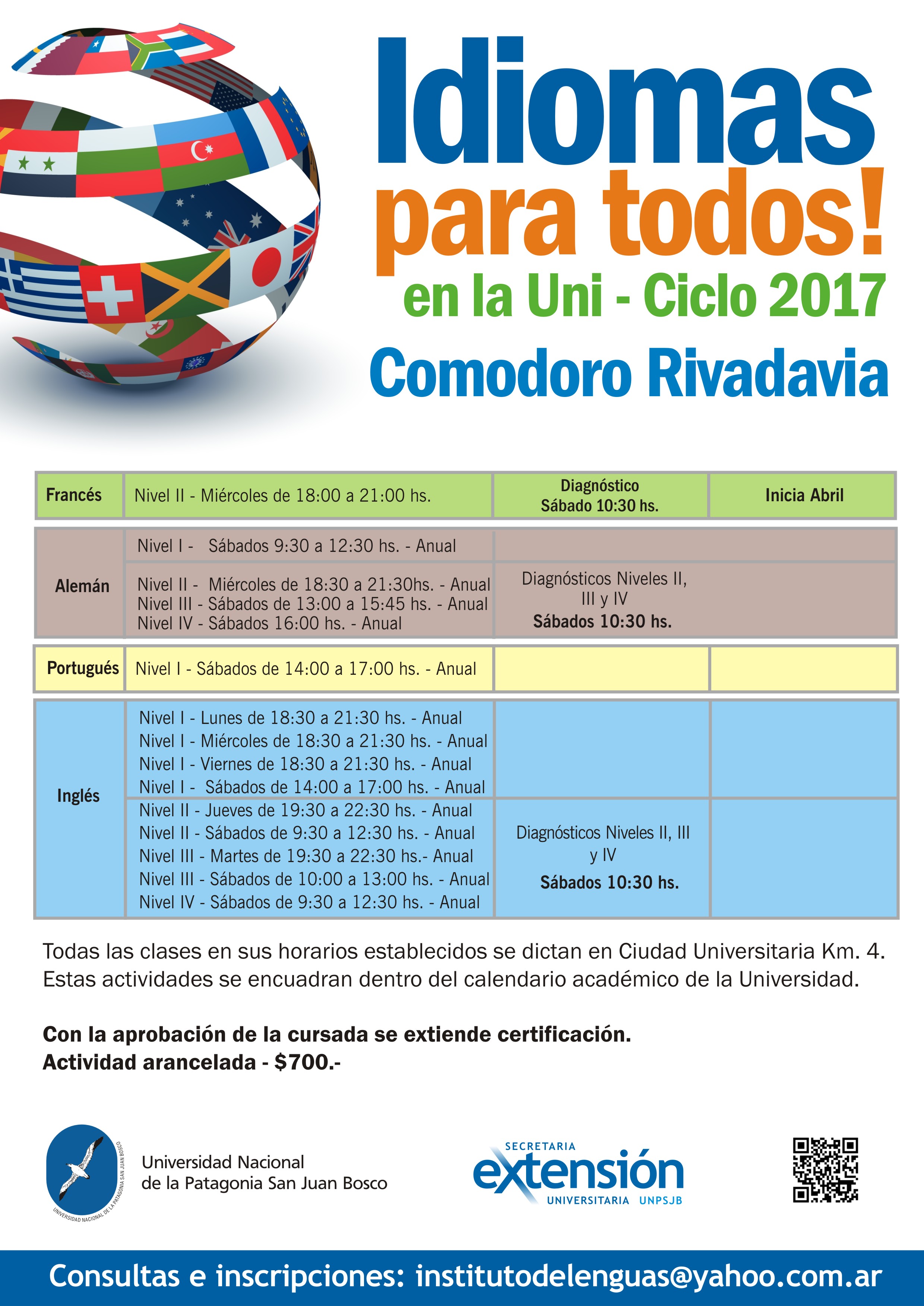 Como cada año, la Universidad Nacional de la Patagonia San Juan Bosco ofrece diferentes idiomas a través de la Unidad de Lenguas dependiente de la Secretaria de Extensión, como una alternativa de calidad, accesible a todo aquel que desee estudiar diferentes niveles de Alemán, Francés, Inglés y Portugués. En esta oportunidad, todos los interesados ya pueden inscribirse a través de la página web de la institución y comenzar sus estudios el próximo mes en la Ciudad Universitaria.