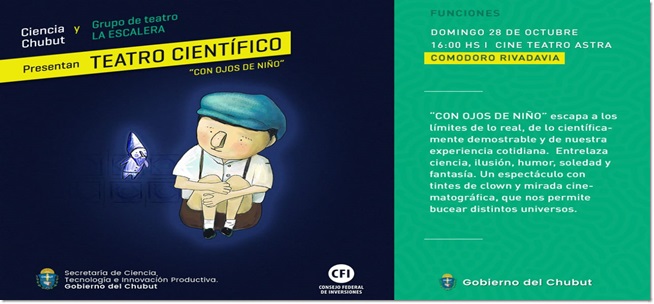 Libre y gratuito. Grupo de "Teatro independiente la escalera". Programa: TEATRO y CIENCIA Secretaria de Ciencia del Chubut