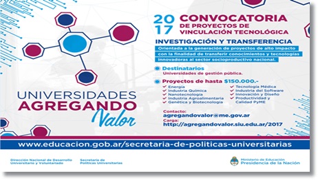 Se ha dado apertura de la Convocatoria de Proyectos de Vinculación Tecnológica “Universidades Agregando Valor” 2017, formalizada en la Resolución SPU Nº RESOL-2017-4285-APN-SECPU#ME. La misma permanecerá abierta para la carga de proyectos desde el miércoles 23 de agosto hasta el viernes 29 de septiembre.