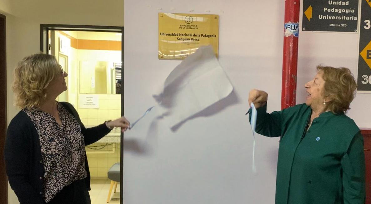 La rectora de la UNPSJB, Lidia Blanco y la Directora del Área Programática Sur de la Secretaria de Salud de la provincia de Chubut, Lorena Abril, y Liliana Barrionuevo, secretaria General de la UNPSJB, pusieron en valor la inauguración del espacio, que permitirá que personas lactantes y a cargo de tareas de cuidado puedan garantizar este derecho.