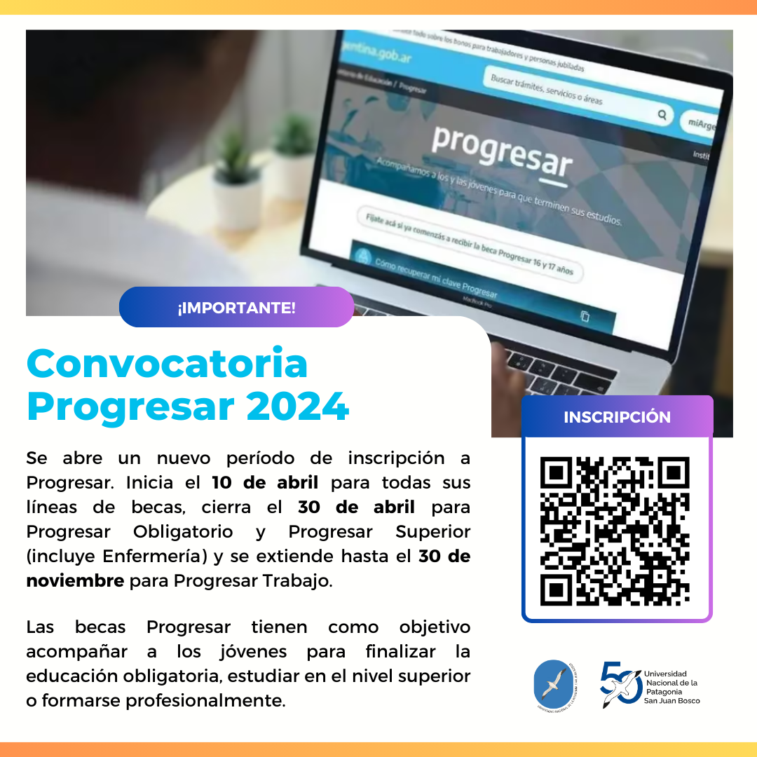 Este inicia el 10 de abril para todas sus líneas de becas, cierra el 30 de abril para Progresar Obligatorio y Progresar Superior (que incluye Enfermería), y se extiende hasta el 30 de noviembre para Progresar Trabajo.