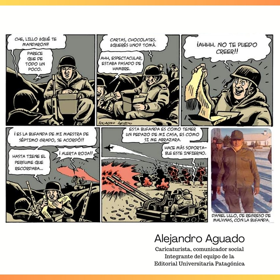 "Escritores y expositores participábamos de una Feria del libro en la localidad de Gobernador Costa, en el centro oeste de Chubut. Un grupo de ex combatientes estaba presente con un stand dedicado a la guerra de Malvinas. Como era la hora del almuerzo, algunos nos acercamos a un salón comedor. Conversábamos con Lillo, un ex combatiente. Me contaba sus experiencias en la guerra. De a poco se fueron sumando más asistentes, que se sentaron en torno nuestro. Permanecían en silencio, abstraídos con sus palabras. Cuando terminó de narrar la anécdota de la bufanda, se lo veía emocionado. Yo tenía un nudo en la garganta. Miré a mi alrededor y nadie hablaba. Algunos lo observaban con expresión de respeto. Otros con los ojos rojos, conteniendo lágrimas. Me dije “Tengo que dibujar su experiencia”. Este es el resultado, y se los comparto. La página se publicó en un libro, una revista y un suplemento del diario Crónica dedicado a la guerra. Es un homenaje a él y a todos los héroes de Malvinas".