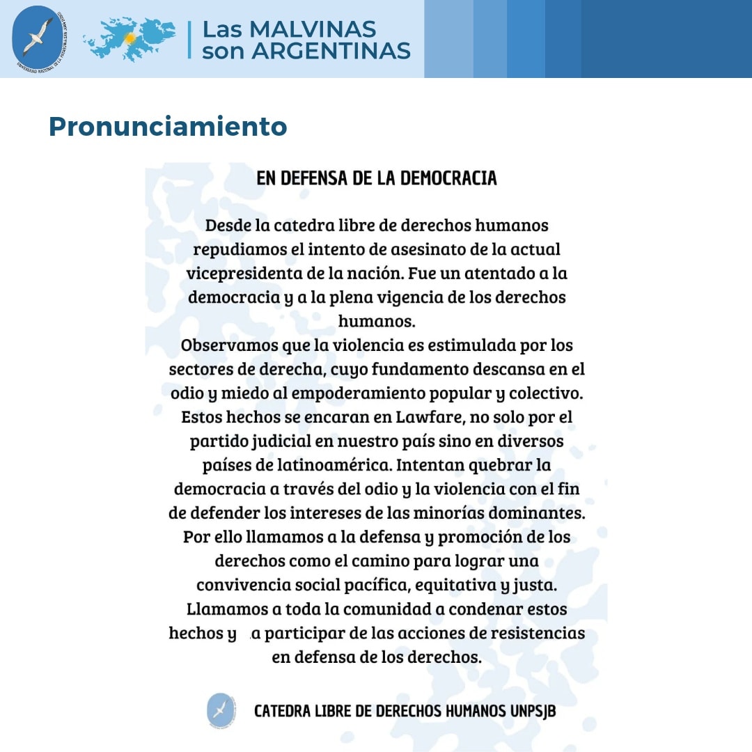 "Desde la Catedra Libre de Derechos Humanos repudiamos el intento de asesinato de la actual vicepresidenta de la Nación. Fue un atentado a la democracia y a la plena vigencia de los derechos humanos.