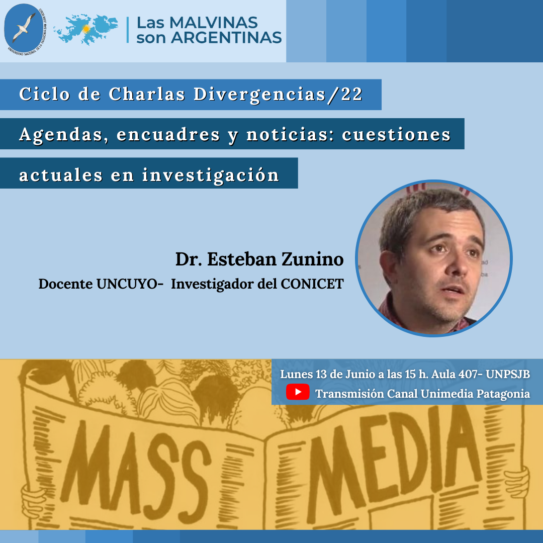Invitado por las cátedras Comunicación, Tecnología y Cultura, Teorías de la Comunicación 1 y Teorías de la Comunicación 2 de la UNPSJB, este lunes 13 de junio el doctor Esteban Zunino, brindará una disertación en la que expondrá acerca de la importancia de los estudios de agenda-setting, con su trayectoria de más de 50 años de investigación, para arrojar luz sobre el funcionamiento de los medios informativos en un contexto cada vez más complejo, tanto en términos tecnológicos como sociales.