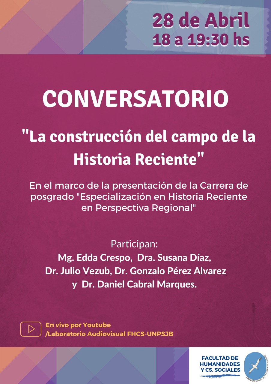 En ese marco, se realizará el conversatorio La Construcción del Campo de la Historia Reciente, con la participación de la Mg. Edda Crespo, Dra. Susana Díaz, Dr. Julio Vezub, Dr. Gonzalo Pérez Álvarez, Dr. Daniel Cabral Márques, el evento se realizará el 28 de abril de 18 a 19.30 horas y podrá seguirse a través de https://www.youtube.com/watch?v=j5WfoaSU8mU