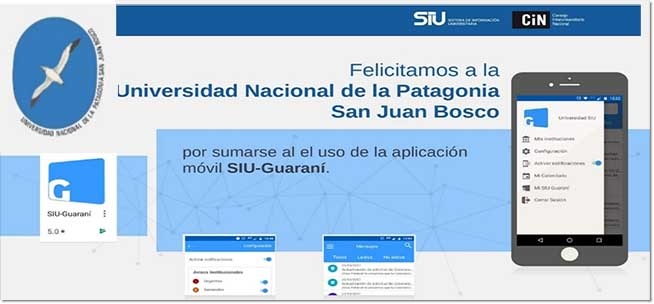 Con enorme orgullo la Universidad Nacional de la Patagonia San Juan Bosco se ha sumado a la utilización de la aplicación móvil SIU-GUARANÍ para celulares. La puesta en funcionamiento de esta aplicación forma parte del trabajo articulado de dos importantes dependencias de la Universidad, integradas por los profesionales Raúl Becette, del Área de Redes y Telecomunicaciones y por Rodrigo Fernández y Marcelo Muñoz del Área de Informática.