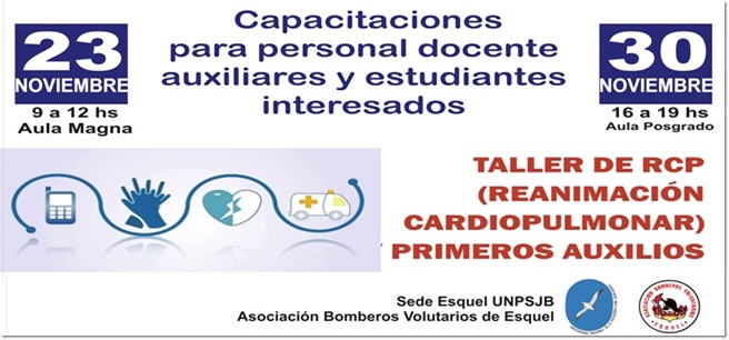 En el marco de las tareas programadas por el Área de Seguridad e Higiene de la Sede Esquel de la UNPSJB, el próximo 23 y 30 de Noviembre se realizarán dos talleres referidos a Reanimación Cardiopulmonar y Primeros Auxilios.