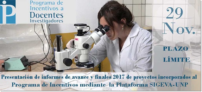La Secretaria de Ciencia y Técnica de la UNPSJB informa a los docentes investigadores que se ha prorrogado hasta el jueves 29 de noviembre de 2018 el plazo para la presentación de informes de avance y finales 2017 de proyectos incorporados al Programa de Incentivos. La carga de los informes se realiza mediante la Plataforma SIGEVA-UNP.