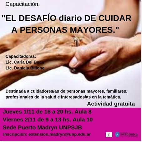 En Comodoro Rivadavia, la Mgr Lidia Blanco, desarrollará hoy (viernes) a partir de las 17 hs, esta charla abierta a toda la comunidad y destinada a las personas que cuidan a ADULTOS MAYORES.
